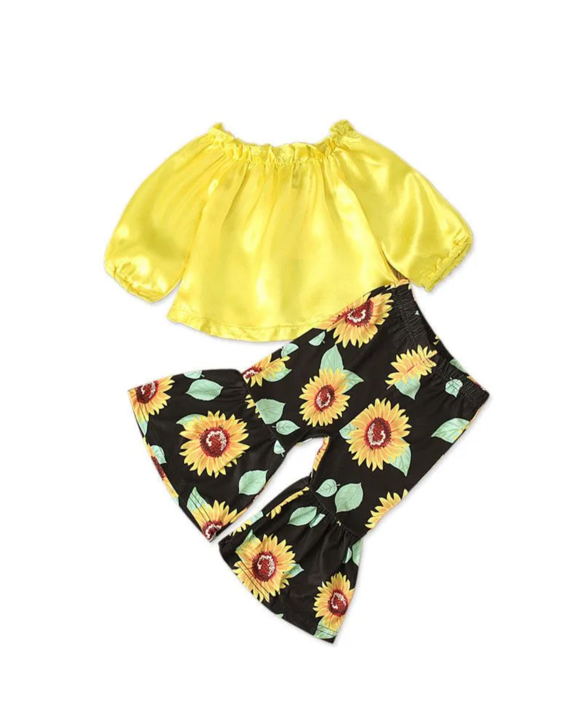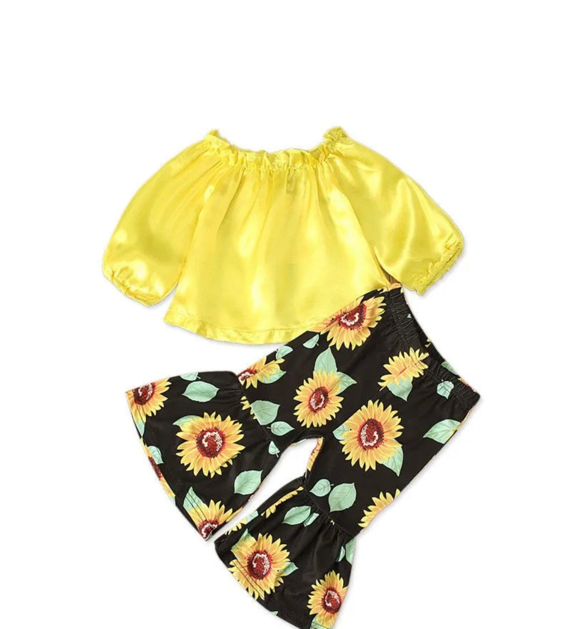 Two piece girls set-Bright yellow top with sun flower bell bottom pants