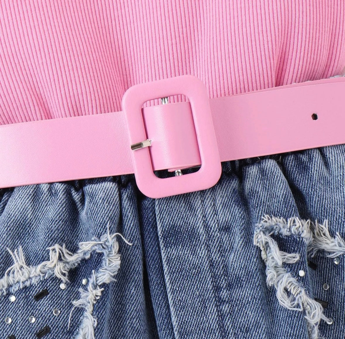 Pink top with ruffles, blue Jean shorts with rhinestones and beads, matching pink belt
